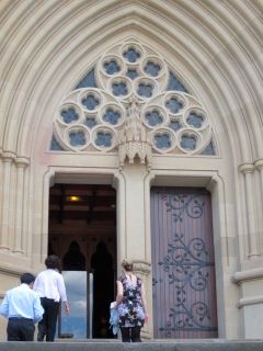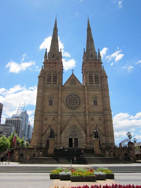 With the great weather yesterday, it was time to finally time to see the most iconic symbol of the city, the Sydney Opera House. As always, I prefer to walk because I love to discover places along the way. And this was a pretty healthy walk. In fact, I walked from the loft to Sydney Harbour to the Rocks, up and across the Sydney Harbour Bridge to the other side and all the way back again. Wish I had a pedometer to measure it. Along the way to the Harbour was St. Mary’s Cathedral, a beautiful cathedral in the center of the city. The doors were open so I walked in. Little did I know that a mass had just started–it was around 1PM. I had to figure out a much more graceful exit than was my entrance. Forget that. Head down, exit straight ahead. Here are some shots of the area: