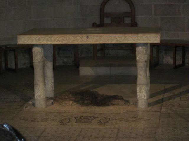 Next stop was Tabgha, the Byzantine monastery recently built when the site of the church of the Multiplication of the Loaves and Fishes was discovered, having been destroyed by the Persians in 614. This original symbol of the Loaves and Fishes is still in the mosaic on the floor of the church.